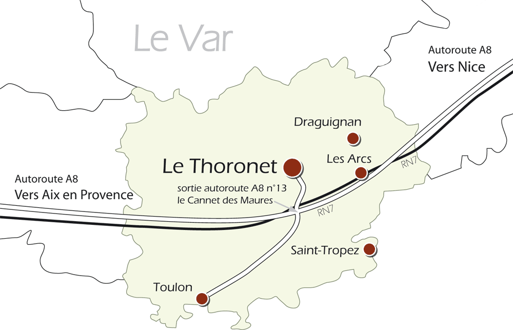 A 8, Ausfahrt Nr. 35 Le Cannet des Maures, am Kreisverkehr der Autobahnausfahrt, nehmen Sie die D 17 in Richtung Thoronet.